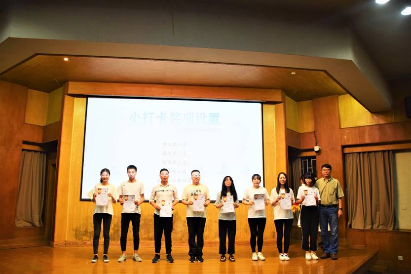 本次比赛创新采用手机自媒体,利用微信平台操作简便受众广泛,统计科学的优势,使用“小打卡”这一小程序,每天向参与打卡同学推送三个专业相关知识点或诗文美句、歌词赏析、传统文化剖析等内容,以抄写、拍照上传、语音反馈形式提高学生的参与积极性,在整个小打卡推送过程中,我院组建了一支以学生线老师为主、学生干部为辅的小打卡管理团队,保证小打卡工作的正常开展,自3月底到5月底为期两个月(休息日无推送),在这期间,共给打卡人数213人,打卡总记录数为987次,其中打卡时间最长学生坚持打卡57天,对学生养成良好的学习习惯有推动作用。本次小打卡活动共计颁发博文奖、智明奖、敏达奖、睿思奖、持之以恒奖共计16人次,均颁发证书及奖金。