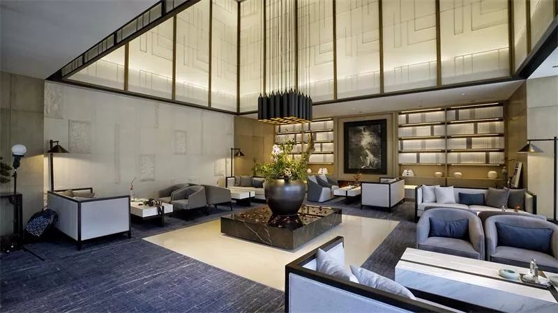 利用陈设品前景中局部开敞的建筑界面或装饰构件,如门洞、窗洞、中部开敞隔断等作为陈设品的景框,使观赏者的视阈收缩,并高度集中于景框前的陈设品上,构成重点突出、层次清晰、景致深远的陈设景致。如图 3.1.16 为了突出酒店廊道端头的景观处理而减弱了前景的形体对比和灯光照明。