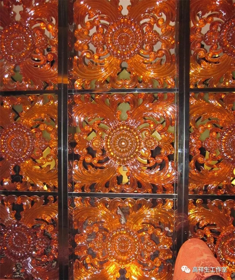 雕花玻璃图案丰富、立体感强,有很强的装饰效果,可用在商业、娱乐、休闲场所的隔断及吊顶等部位(图 4-2-3)。花型图案也可根据设计要求制定。