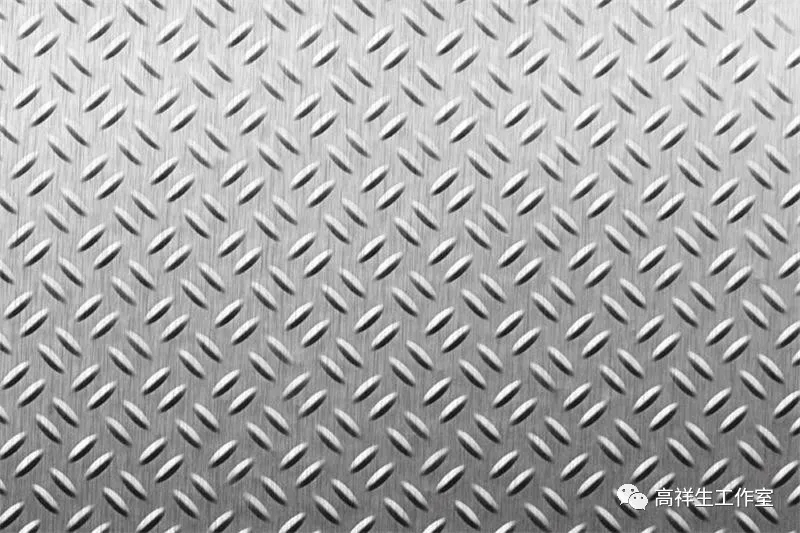 铝合金花纹板是以防锈铝合金为基质,用特制的花纹轧制而成的。它具有精致的花纹,不易磨损,防滑性能好,防腐性强,便于冲洗(图6-3-1)。表面经处理可呈现不同的颜色。广泛用于墙面、电梯门等部位的装饰。