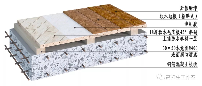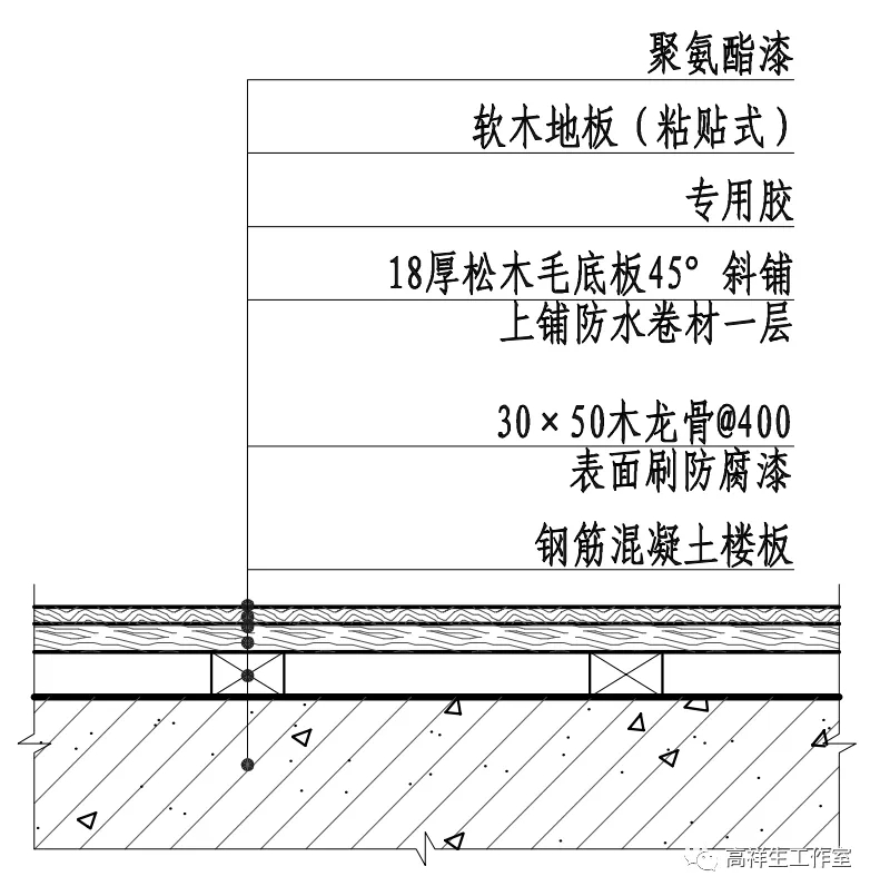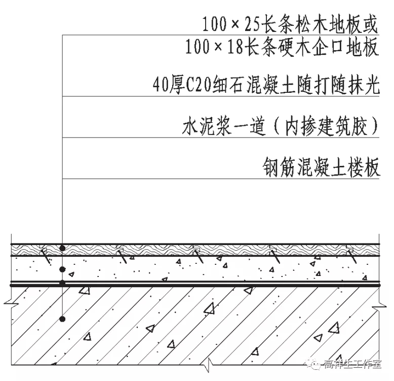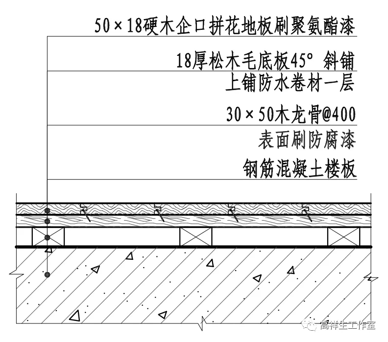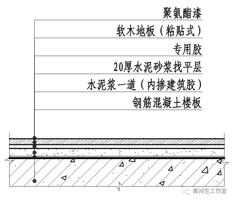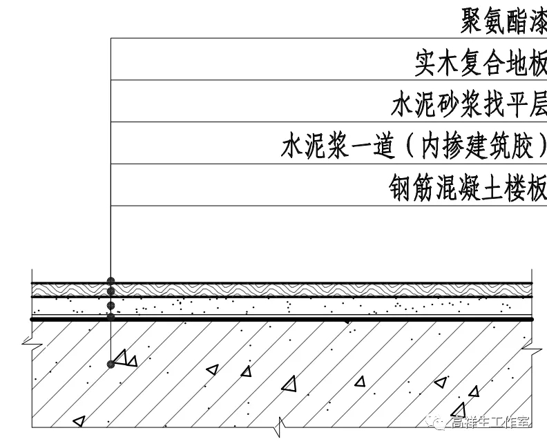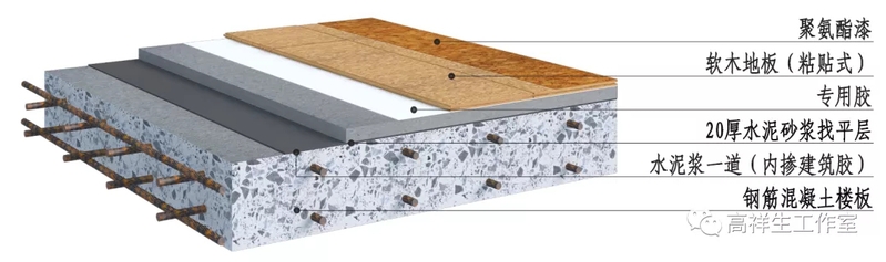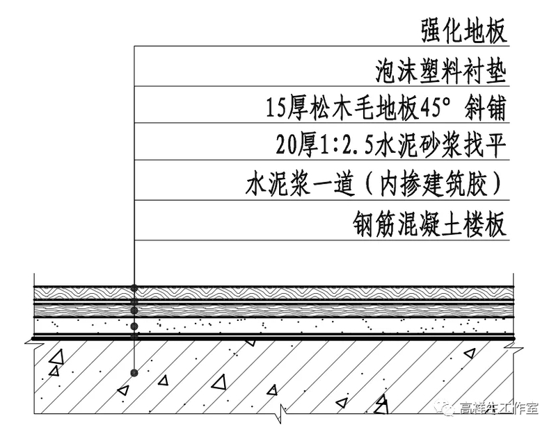 图 12-4-20 平铺强化地板地面构造节点图(松木毛地板)