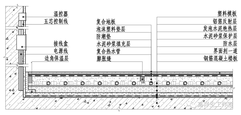 图 12-9-7 复合地板水暖地面构造节点图(发泡水泥绝热层)