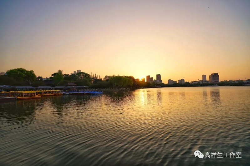 夕阳下湖岸楼宇接踵 湖中碣石佇立 高祥生摄影