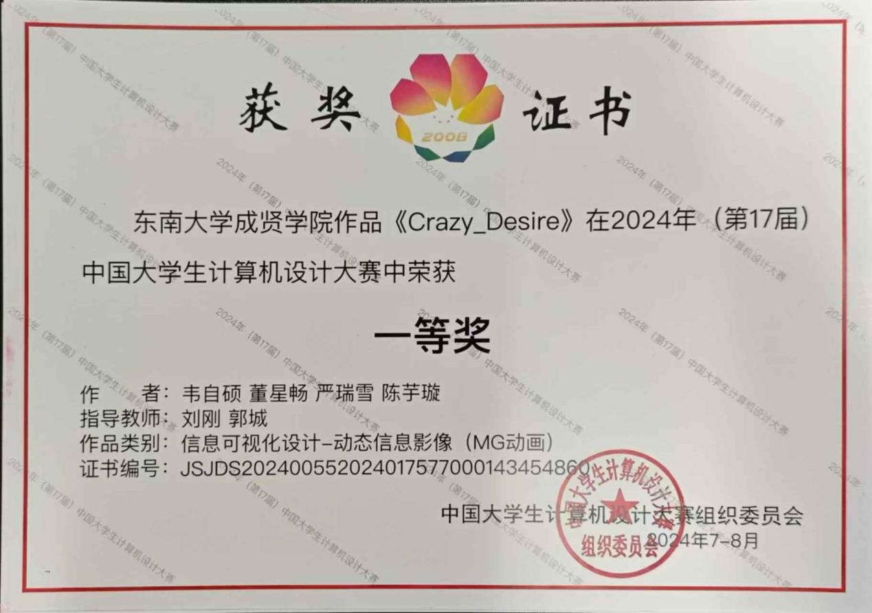 近日,2024年(第17届)中国大学生计算机设计大赛(信息可视化设计组)杭州决赛区拉开帷幕,该项赛事为教育部计算机类教指委发起举办,大赛组委会由北京语言大学、中国人民大学、华东师范大学、东南大学、厦门大学、山东大学、东北大学等高校,以及清华大学、北京大学等高校的教师组成。我校kaiyun官方网站入口在郭城、刘刚两位专业教师的指导下,组织学生制作了《嘉定不可移动文物》与《crazy desire》两部作品,5月在江苏海洋大学举行的省赛决赛中分获江苏省省赛决赛一、二等奖并闯入决赛,7至8月期间,师生团队利用假期期间经过数次作品打磨和路演演练答辩,最终在浙江师范大学举行的国赛决赛中《crazy desire》作品荣获全国一等奖,《嘉定不可移动文物》作品荣获全国三等奖,再次刷新了我院在该项重大赛事中的获奖纪录。