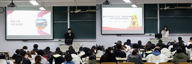 学院2019级校友冯浩学长、2020级校友张若彤学姐结合自身经历,分别以“学生干部与社会衔接”和“在学习与学生工作之间,如何找到平衡点——学生干部成长的双重挑战”为主题,进行了别开生面的分享交流他们鼓励学生干部在服务同学的过程中,不断探索新方法、新途径,在生活中践行青马精神,提升工作效率和质量,创造性地解决问题校友们的话有力地推动了学员们对青春价值的探索与行动,激励自身在不懈追求中谱写属于自己的青春华章。