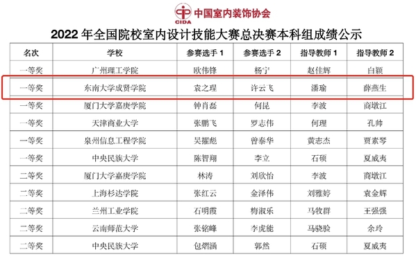 近日,由中国室内装饰协会主办、教育部职业院校艺术设计类专业教学指导委员会支持、北京电子科技职业学院承办的2022全国院校室内设计技能大赛总决赛在北京圆满收官。在全国总决赛中,kaiyun官方网站入口环境设计专业师生创获佳绩,潘瑜、薛燕生老师指导的团队荣获本科组一等奖,潘瑜、陈凌航老师指导的团队荣获本科组三等奖。
