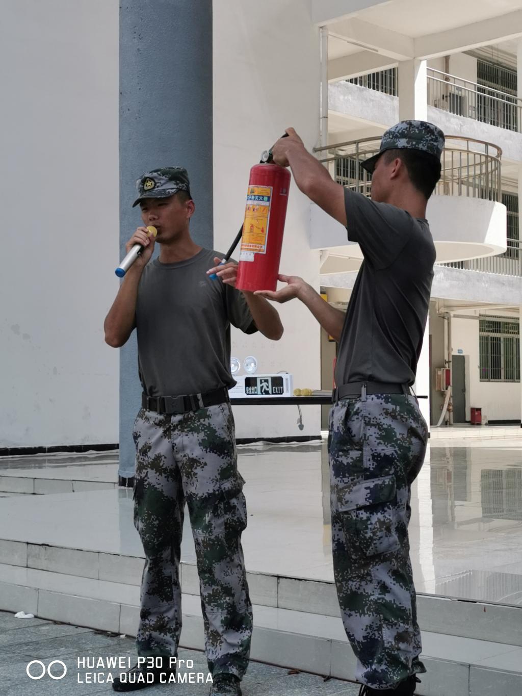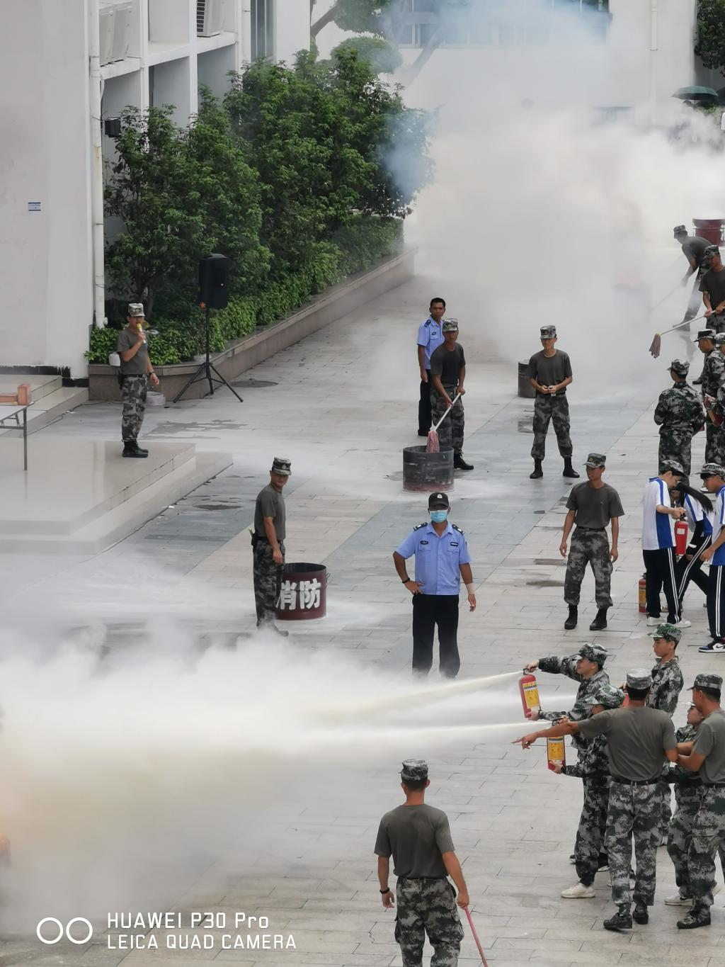 演练分三步骤进行。首先由詹建业副处长给全体新生讲解消防和应急疏散常识,接着让新生体验模拟火灾应急疏散过程,最后由军训教官讲解两种灭火器的使用方法并让同学们熟悉灭火器的操作。