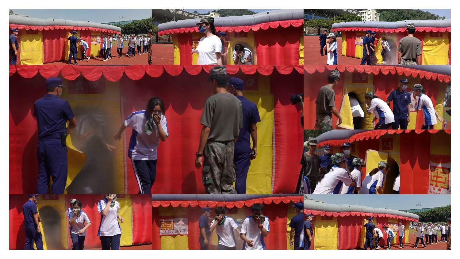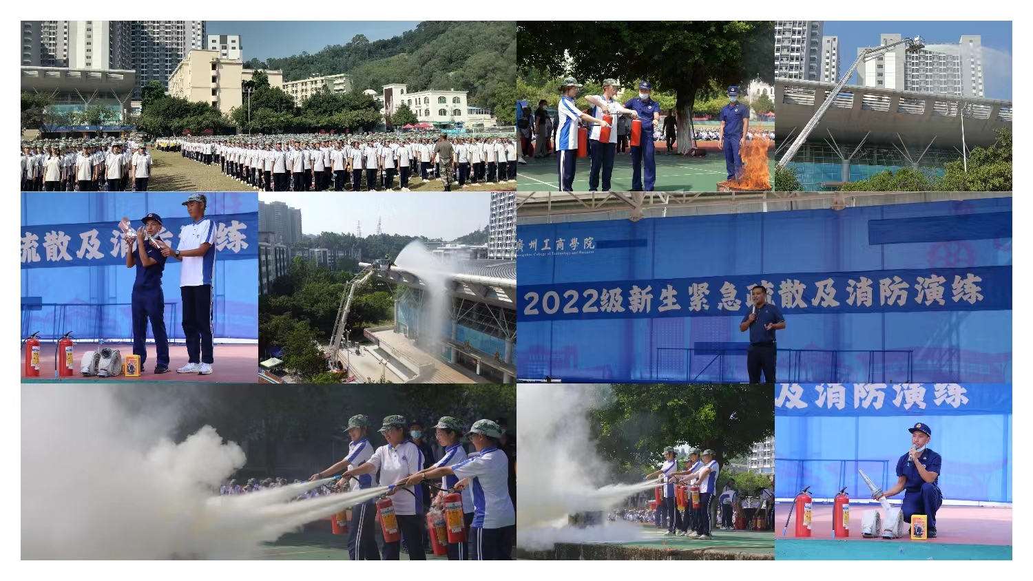 本次演练分为消防应急疏散演练和消防器材灭火演练,保卫处詹建业副处长担任演练副总指挥,花都区狮岭消防中队邓春明队长协助开展工作,全体新生辅导员、宿管员、学生宿舍长及花都校区校卫队员全程配合。演练开始前,詹建业副处长详细讲解了火灾的危害、火灾预防的技巧、应急疏散和火灾逃生的要领等方面的知识。狮岭消防救援中队邓春明队长向广大师生讲解了校园常用灭火器材的使用操作方法,防毒面具的正确佩戴以及如何利用消防灭火器扑灭初期火灾。演练过程中,狮岭消防中队展示了消防高喷高压车,举高云梯车,并利用高压喷雾水枪扑灭油火,最后组织了新生体验消防逃生体验屋和利用干粉灭火器实操灭火。