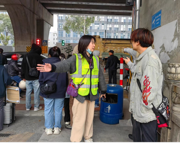 为指引师生通过专用通道进入网约车停车场,减少在桥边及高架桥下候车和上车的情况,疏导由北区前往东区的师生过斑马线,保卫处请来了各二级学院的志愿者,为师生出行提供引导服务。