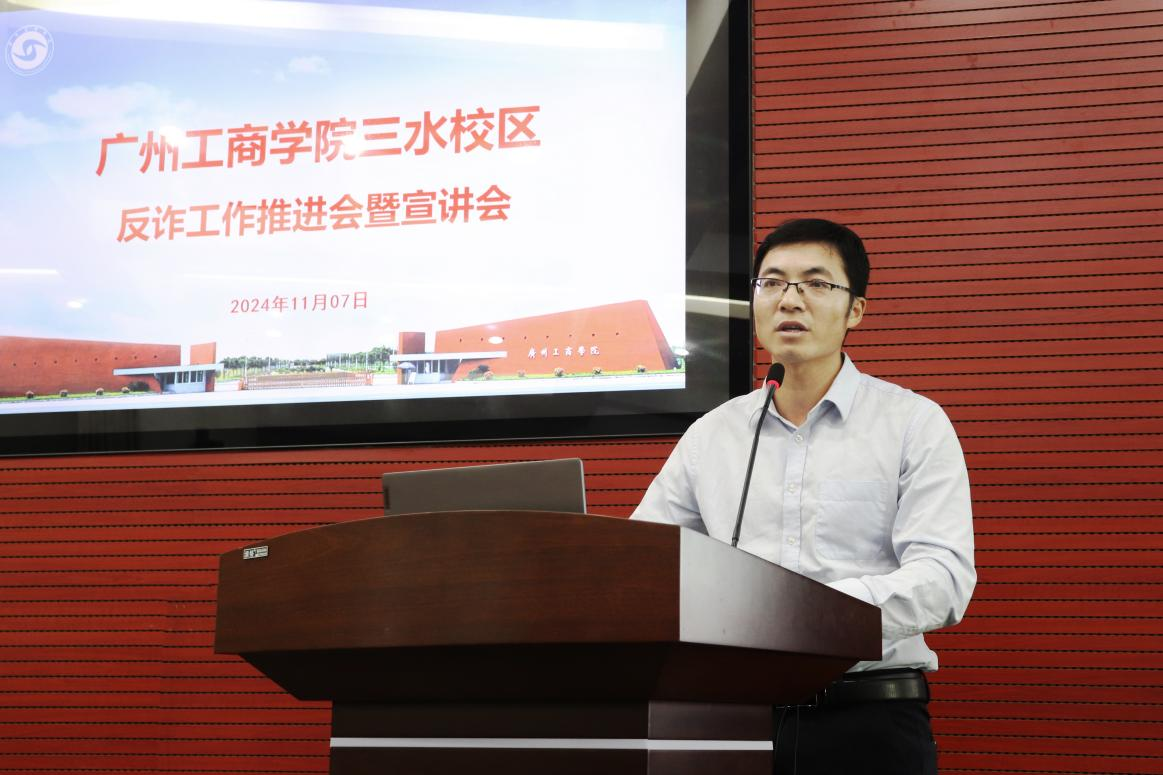 管委会主任谭全在发言中通报了校区近期师生电信网络诈骗情况。他指出,目前三水校区师生电信诈骗案件仍处于高发状态,强调全体师生在反诈工作中要杜绝形式主义,各部门要抓落实、促成效。他还部署了八项工作重点,包括加强宣传教育、完善联防联控机制、强化技术防范等,并提出多项反诈宣传措施。