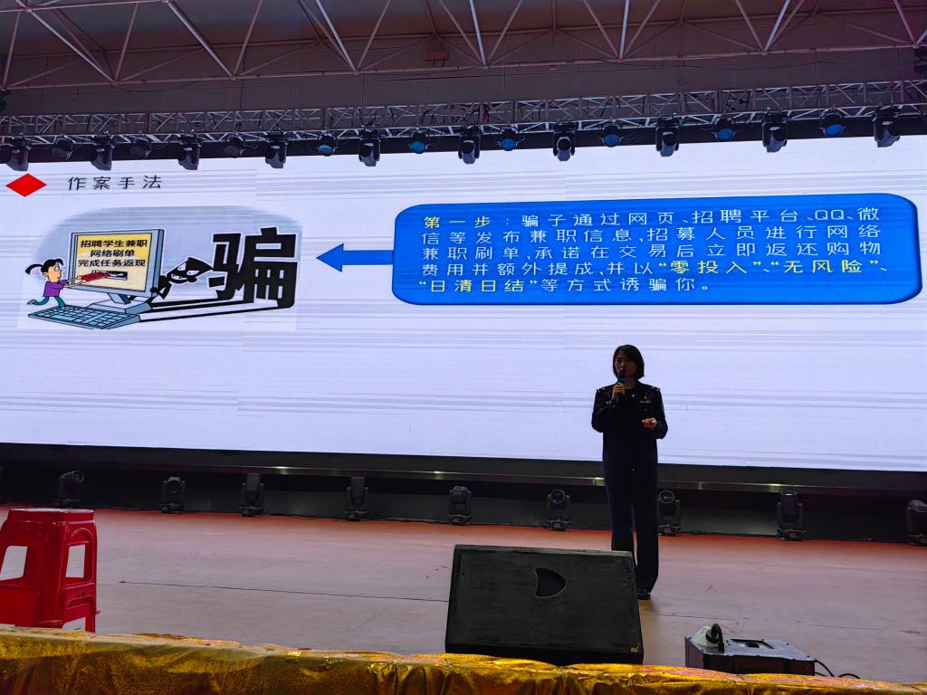 讲座现场,民警充分利用PPT、视频等方式向学生们详细的讲述了电信诈骗的危害、特点及作案手法等,对常见的网络兼职刷单诈骗、网络贷款诈骗、冒充购物客服退款诈骗,冒充熟人亲友类诈骗等诈骗方式做了详细的描述,并结合真实案例,以案说骗。