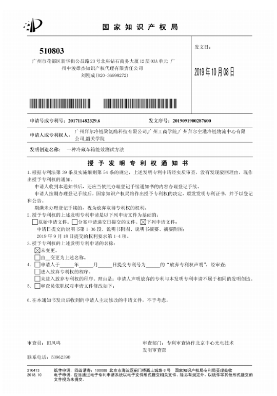 【本网讯】近日我院与广州拜尔空港冷链物流中心有限公司联合申报的“一种冷藏车箱能效测试方法”收到国家知识产权局《授予发明专利权通知书》,这标志着我院第一个授权发发明专利诞生,也是beat365在授权发明专利的重大突破。