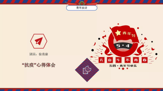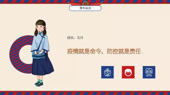 青年团对“抗疫”进行演讲,吴丹同学为我们演讲“疫情就是命令,防控就是责任“;徐勇康同学向我们分享了他的“抗疫”心得体会;张润熙同学在疫情期间做青年志愿者,给我们分享了他在当志愿者所学到的知识。