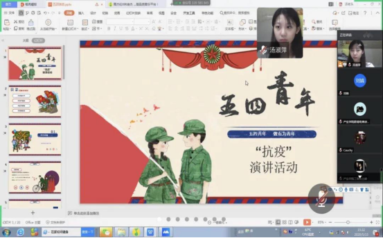 同学们认真聆听他们的演讲,感触颇深。听完同学的演讲,大家一起观看“抗疫”音乐视频,青年团员向“抗疫”英雄献上才艺表演。借助会议的活跃氛围,来自五湖四海的同学们相互讨论各自当地的疫情情况,同时还表达对大家的思念。