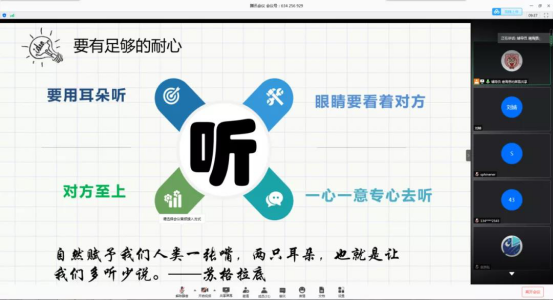 家长与孩子最好的相处方式就是像朋友一样,辅导员唐海恩老师给大家分享了几个亲子相处的小技巧,双方需要有足够的耐心,并且家长应该允许孩子做自己,同时还需要设置清晰而有弹性的边界是良好的亲子关系的基础。本次会议在家长与同学们认真聆听与互动中结束。