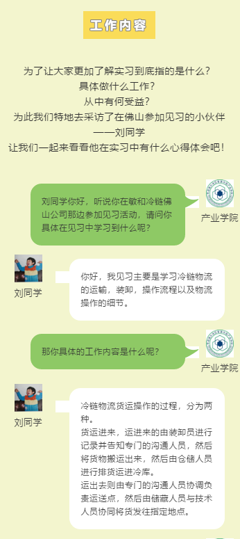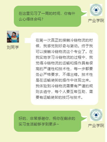 2020年暑期社会实践,产业学院提供了一些冷链物流企业资源供让同学们到企业参加见习活动,同学们通过见习学习巩固了在校学到的专业知识,加深了对冷链物流行业的了解,为以后进入社会做好铺垫。