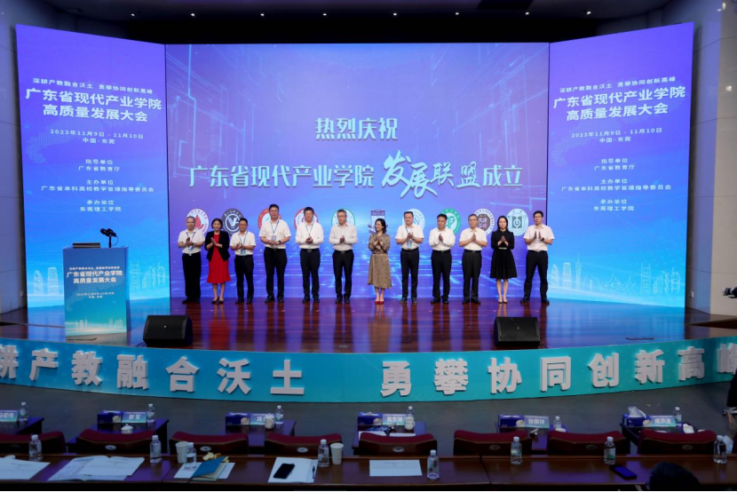 在全场参会代表的见证下,广东现代产业学院发展联盟正式成立。该联盟由省内参与现代产业学院建设的高校、企业、行业组织等单位组成,以国家产教融合、新发展理念为指导,共同开展现代产业学院建设理念、方法和模式探索实践,引领我省现代产业学院建设,培养大批现代产业发展需要的高素质应用型、复合型、创新型人才,为广东省产业竞争力提升和汇聚发展新动能提供人才支持和智力支撑。同时大会发布了《广东省高质量建设现代产业学院的共识(广东共识)》。