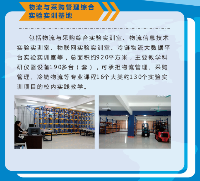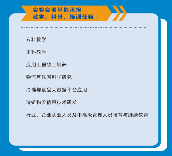 实验实训及基地包含物流综合实验实训室、物流信息技术实验室、物联网及其应用实验室、冷链物流设备实验室、食品微生物实验室(冷链物流)、食品理化分析实验室(冷链物流)、食品工艺实验室、冷链物流大数据平台等8个实验实训室构成。