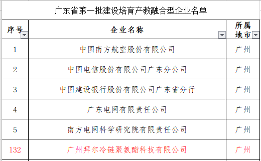 8月21日,由广东省教育厅、工业和信息化厅、人力资源和社会保障厅、国家开发银行广东分行等部门开展了第一批产教融合型企业评审相关工作,对广东省第一批产教融合型企业建设培育名单予以公示。其中,智慧冷链产业学院共建单位—广州拜尔冷链公司位列其中。