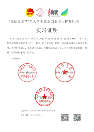 2020年7月6日至8月14日,产业学院19级吴丹同学积极践行学院“五进”教育实践活动之“进社会”的教育理念。参与了“展翅计划”广东大学生就业创业能力提升行动,在团英德市委进行了为期一个多月的社会实践活动,并得到了单位领导及同事的一致肯定。