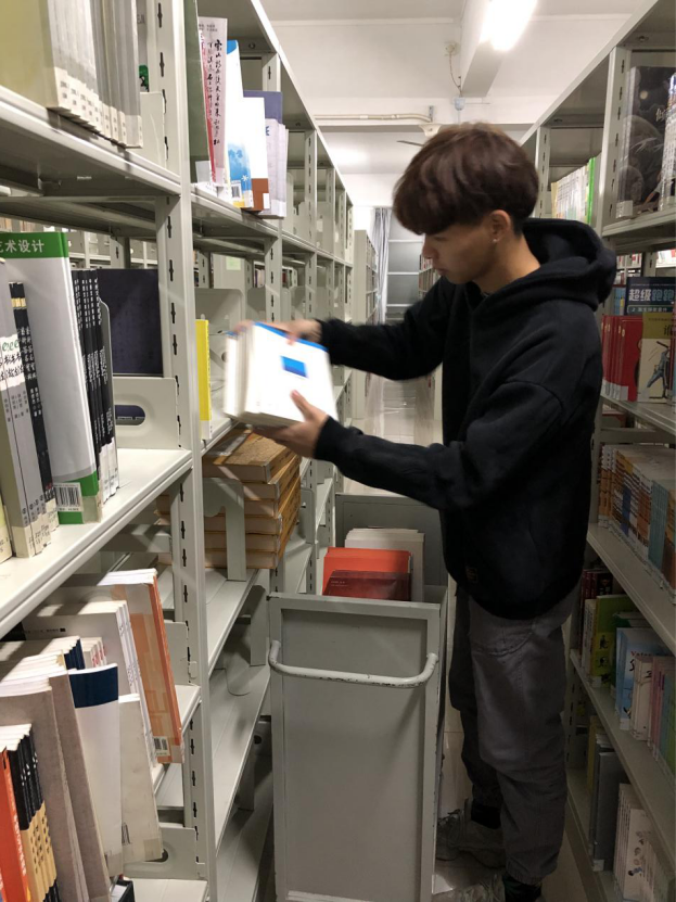 两名同学在图书馆老师的指导下,开始了相应的志愿工作。两人主要负责书籍的搬运及整理工作,虽然是第一次接触,但在老师的指导下,同学们的动作也越来越娴熟。小小的书籍不止有大大的力量,也有重量,但也难不倒两位男子汉,搬书、放书、整理,一些列的操作,体现着奉献精神。