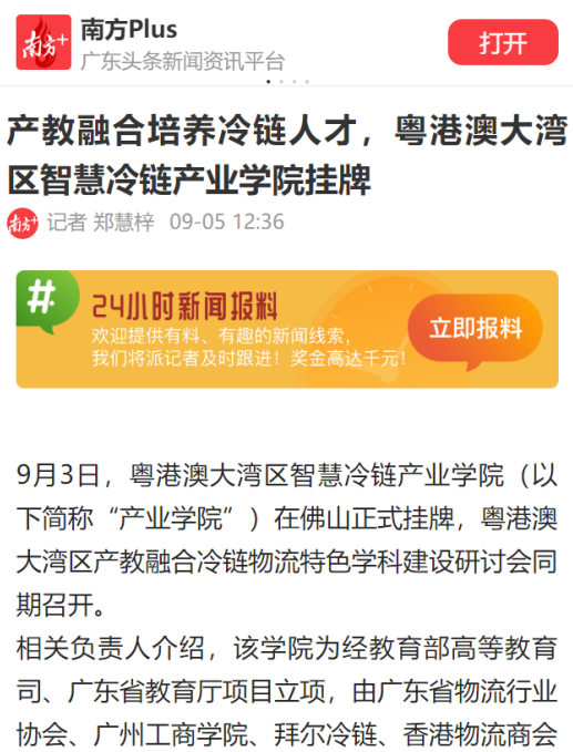南方日报报道粤港澳大湾区智慧冷链产业学院挂牌成立