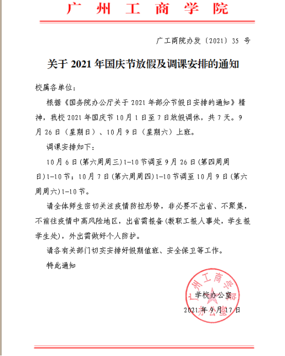 关于2021年国庆节放假及调课安排的通知