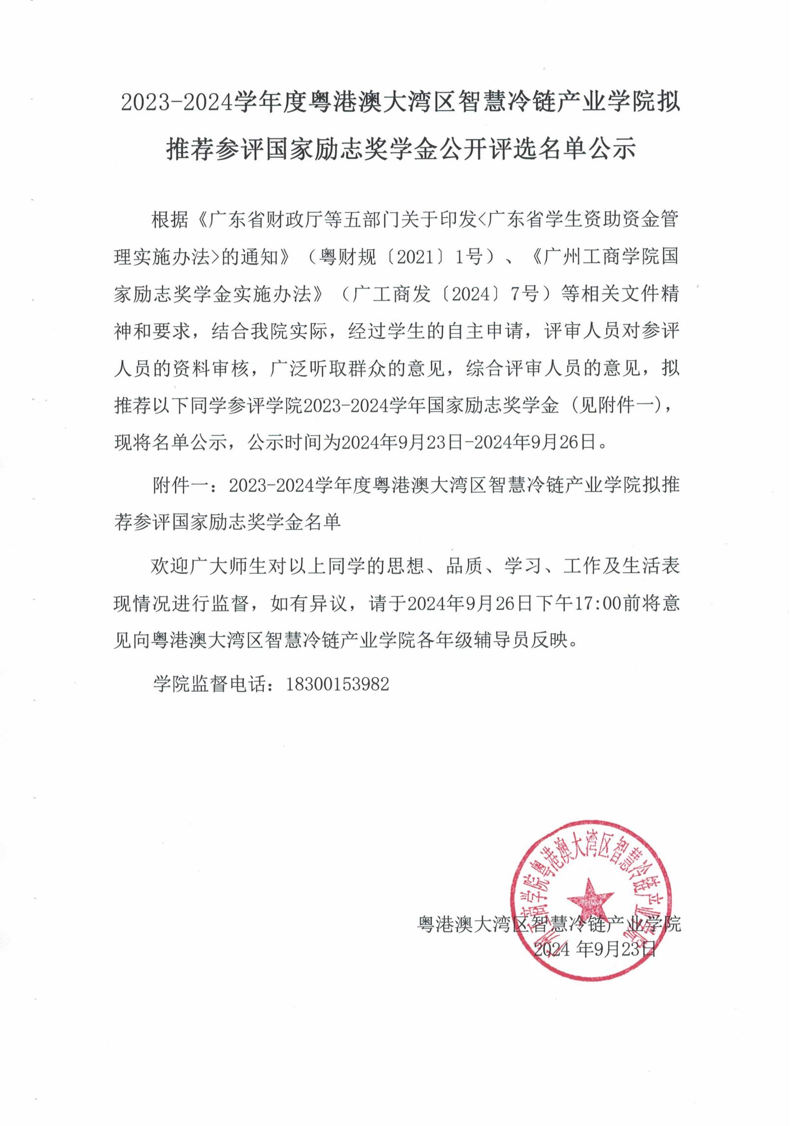 2023-2024学年度粤港澳大湾区智慧冷链产业学院拟推荐参评国家励志奖学金公开评选名单公示