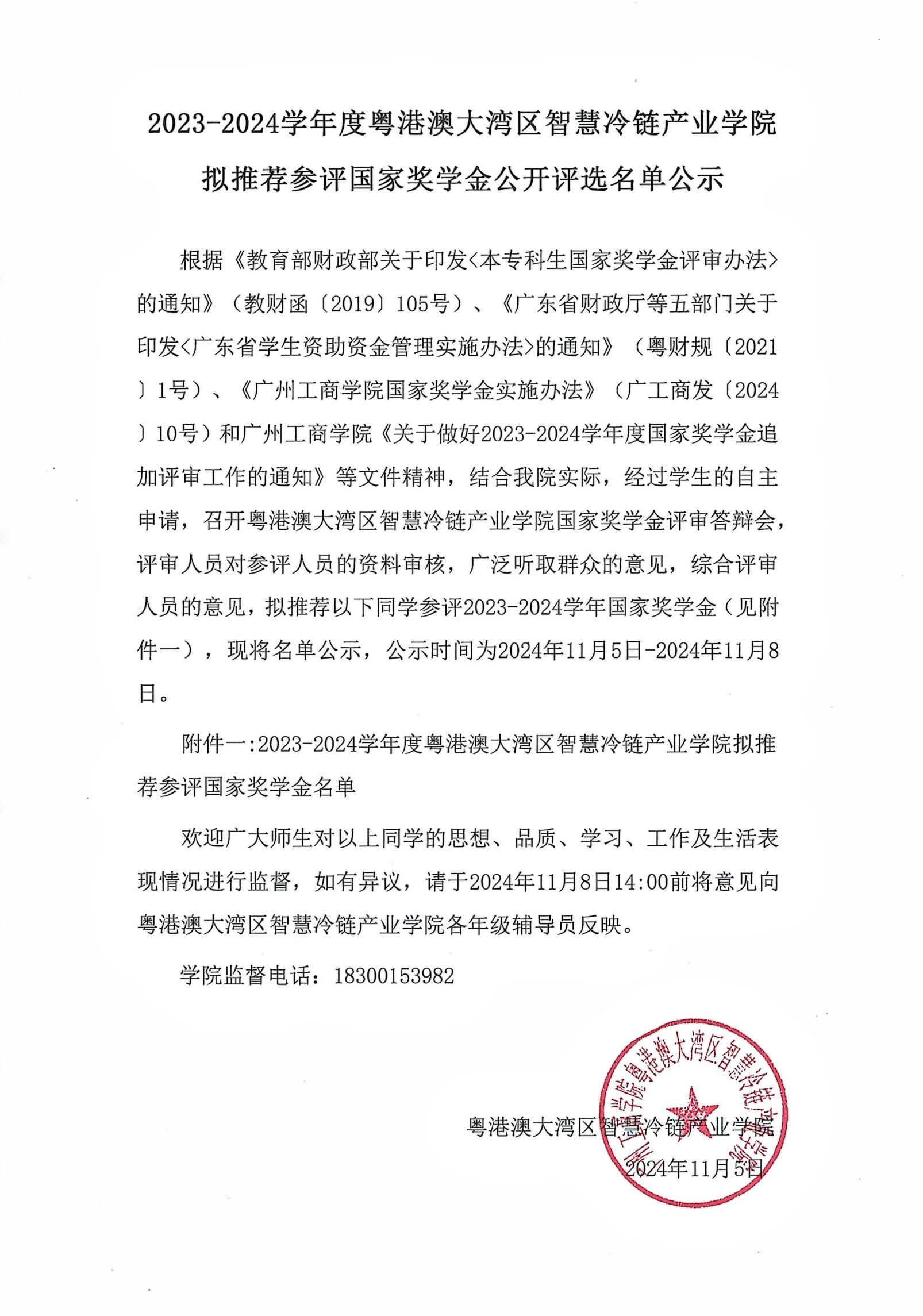 2023-2024学年度粤港澳大湾区智慧冷链产业学院拟推荐参评国家奖学金公开评选名单公示