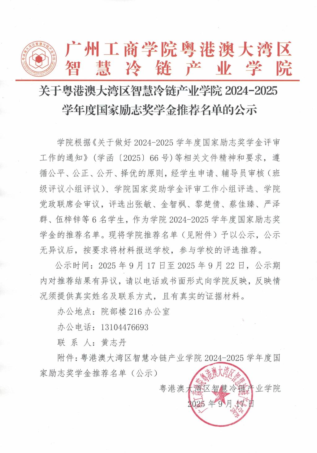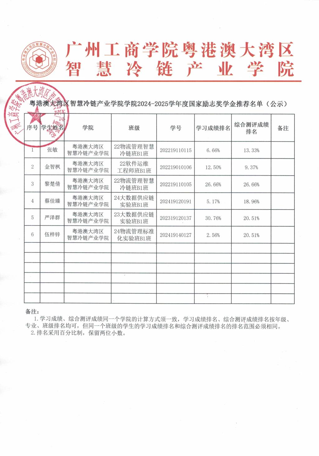 关于粤港澳大湾区智慧冷链产业学院2024-2025学年度国家励志奖学金推荐名单的公示