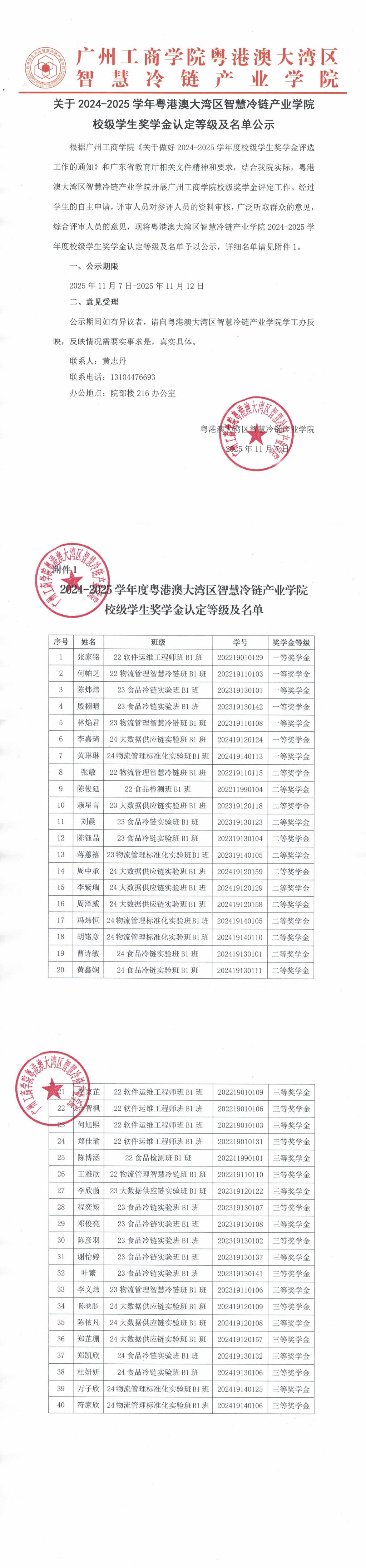 关于粤港澳大湾区智慧冷链产业学院2024-2025学年2022级、2023级符合新生奖学金发放条件的名单公示