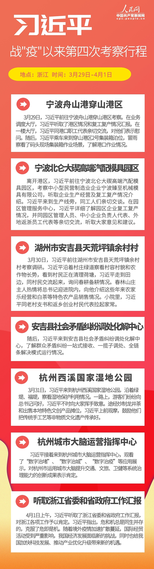 【编者按】3月29日至4月1日,中共中央总书记、国家主席、中央军委主席习近平先后来到浙江宁波、湖州、杭州等地,深入港口、企业、农村、生态湿地等,就统筹推进新冠肺炎疫情防控和经济社会发展工作进行调研。