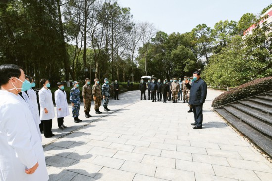 2020年3月10日,中共中央总书记、国家主席、中央军委主席习近平专门赴湖北省武汉市考察新冠肺炎疫情防控工作。这是习近平在火神山医院办公楼外广场接见湖北省和军队、外地支援湖北医护人员代表,致以亲切慰问和衷心感谢。 新华社记者 谢环驰/摄
