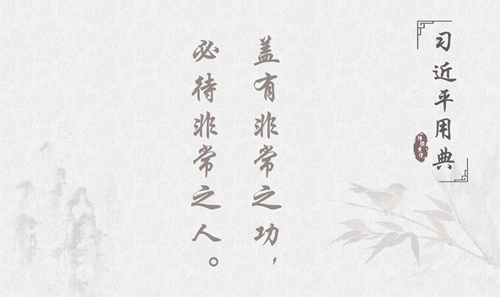 “盖有非常之功,必待非常之人”,出自汉武帝元封五年(公元前106年)命令州郡举荐贤才的诏书。意思是,要建立不寻常的功业,必须依靠不寻常的人才。汉武帝始终将自己定位为一位“常人所异”的帝王,他一生中所用多为“非常之人”,诸如卫青、霍去病等人;所做多为“非常之事”;所成多为“非常之功”。故《汉书》赞曰:“汉之得人,于兹为盛”。