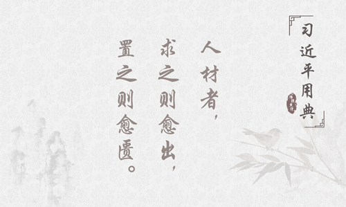 2018年4月在庆祝海南建省办经济特区30周年大会上,习近平总书记引用此典指出:“海南要坚持五湖四海广揽人才,在深化人才发展体制机制改革上有突破,实行更加积极、更加开放、更加有效的人才政策,创新人才培养支持机制,构建更加开放的引才机制,全面提升人才服务水平,让各类人才在海南各尽其用、各展其才。”时隔一个半月,他又在两院院士大会上再次引用说:“各级党委和政府要以识才的慧眼、爱才的诚意、用才的胆识、容才的雅量、聚才的良方,放手使用优秀青年人才,为青年人才成才铺路搭桥,让他们成为有思想、有情怀、有责任、有担当的社会主义建设者和接班人。”
