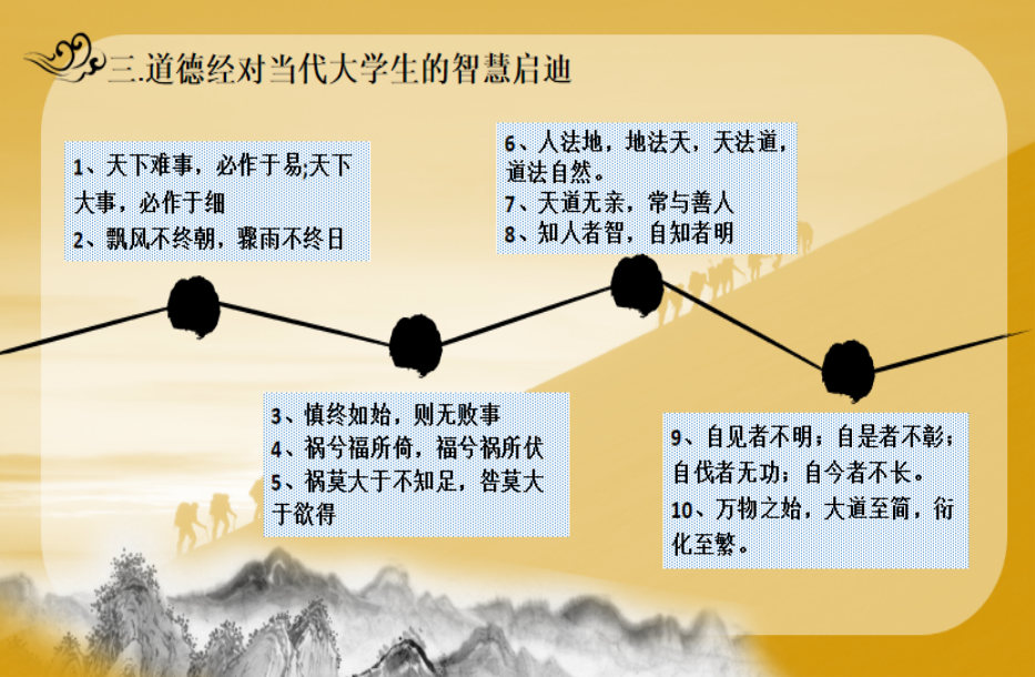 唐副教授重点对《道德经》进行了三个方面的导学:一是介绍《道德经》及其作者;二是解读《道德经》的重点章节,三是分享感悟:道德经对当代大学生具有启迪的智慧。在第二部分导读重点章节时,主要是学习原文,讲解译文,拓展阐释。通过原文与译文的对照解释,力图帮助克服害怕古文晦涩难懂的心理障碍,提升同学们阅读理解原文的能力。而在拓展阐释时,引导同学们要联系当代社会现实的思想渊源以加深对内容的认知与理解,重点突出传统经典中的名言名句在指导大学生做人做事时的现实指导意义,并强调辩证地分析与对待经典中的部分观点,注重创新性的转化与运用。