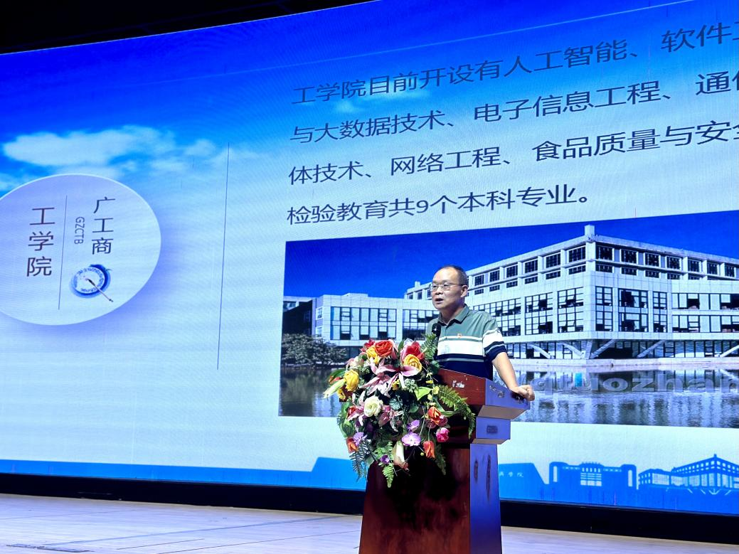 宋锋华教授围绕着"筑梦广工商·从工学院扬帆起航"这一主题展开讲述,他指出,进入新时代,党和国家对科学知识和卓越人才的渴求比以往任何时候都要更加强烈。因此,作为广工商的新学子,我们要有明确的大学观,学习新的知识,研究新的学问,以梦为马,不负韶华。
