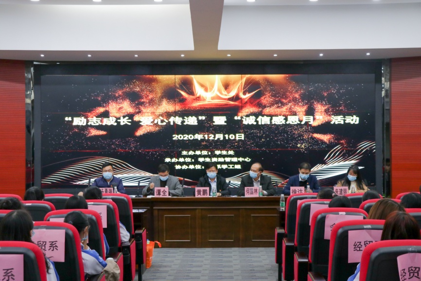 【本网讯】12月10日,学校“励志成长 爱心传递”暨“诚信感恩月”启动仪式在三水校区办公楼报告厅举行。学校党委副书记、院长助理、学生处处长黄鹏,三水校区管理委员会、关工委主任何国林,学生处副处长谭全,学生处副处长徐达,校友会办公室副主任汤勇强,各院系学工组组长,资助工作经办人,学生资助管理中心全体老师及200余名学生参加了。