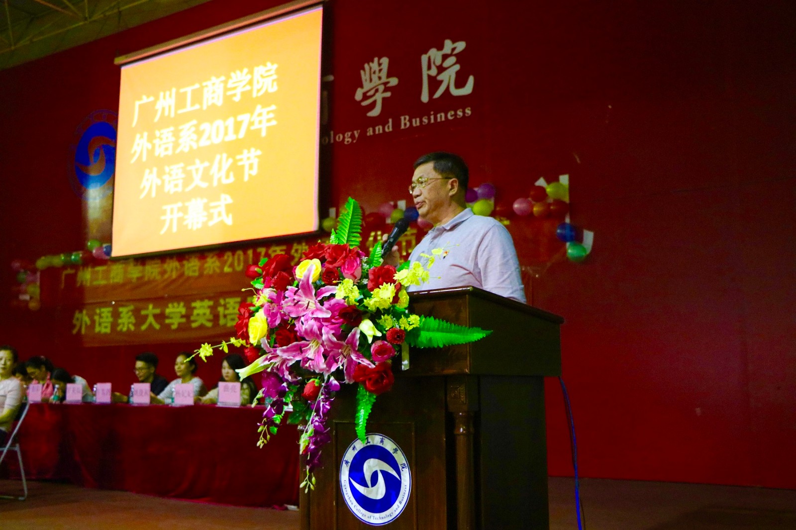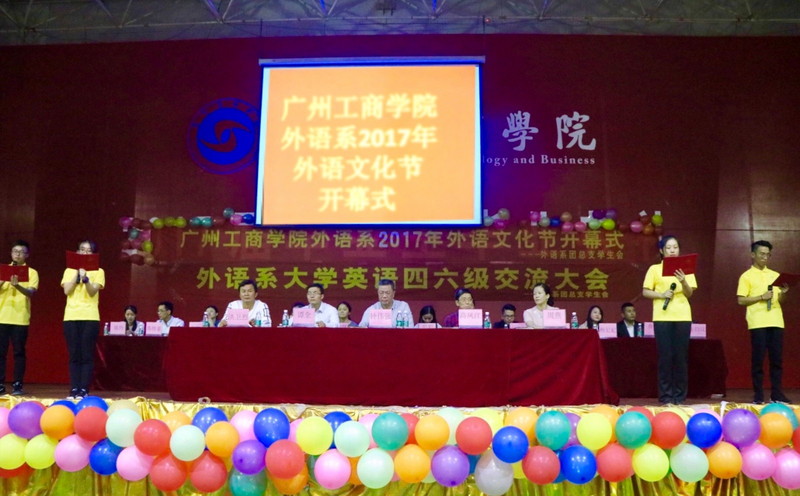 【本网讯】2017年10月24日,beat365在线体育官网登录入口外语系2017年外语文化节开幕式在花都校区体育馆顺利举行。出席本次开幕式的嘉宾有学院党委书记兼副院长钟伟强同志,外语系主任高凤江教授、副主任周燕老师,学生处副处长谭全老师,共青团beat365在线体育官网登录入口团委洪卫烈老师,外语系办公室主任陈均议老师,外语系专业老师代表牛雪剑、姚捷茜老师,以及外语系各位学工组老师们。外语系786名学生代表参加了本次开幕式。