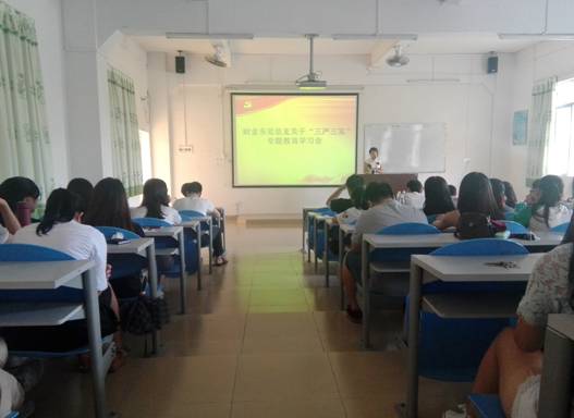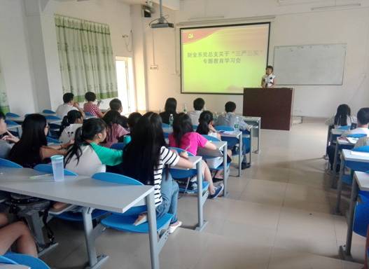 【本网讯】2015年10月22日下午,财金信息管理系在花都校区经管楼101教室召开了“三严三实”专题教育学习会。学习会由党总支书记全桂艳主持,系教工党员和学生党员代表参加了此次会议。