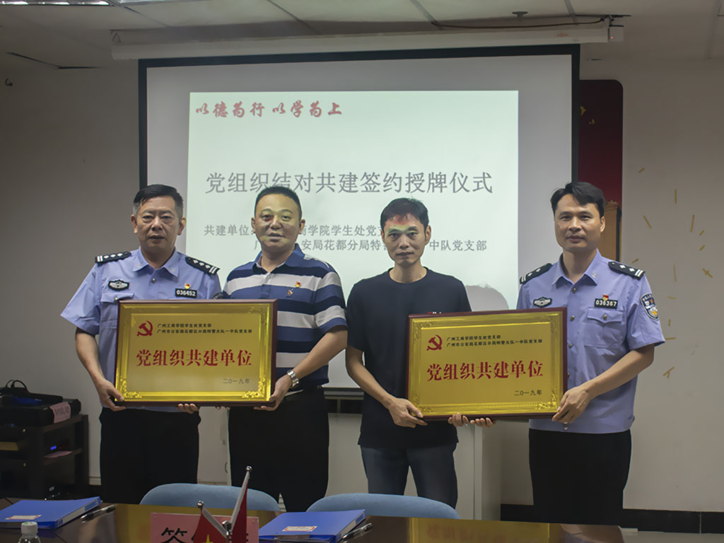 广州市公安局花都区分局特警大队党总支副书记、纪检专干汤涛秋、特警大队一中队党支部书记、中队长谭建新、特警大队一中队党支部委员缪丽君、吴尚桂、罗国杰,我院党委副书记、学生处处长黄鹏,学生党总支书记、学生处副处长徐达,学生党总支委员、学生管理科副科长罗文威,学生处党支部书记、学生管理科副科长晏芳林,学生处党支部委员、资助管理中心负责人朱建丽,学生处党支部委员郑杰,学生督察队代表出席签约授牌仪式。罗文威老师主持本次的签约授牌仪式。