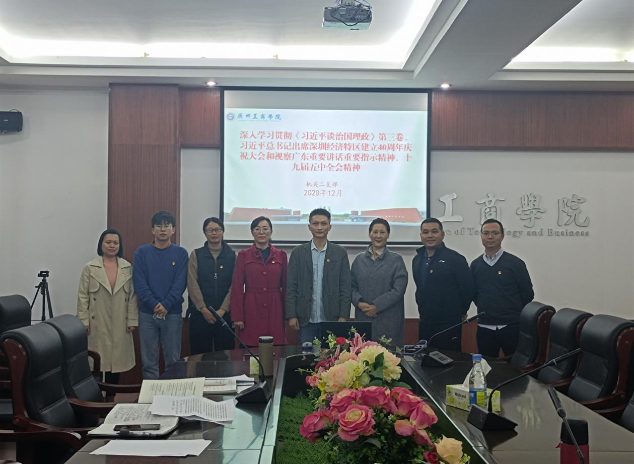 【本网讯】12月7日,机关二党支部在花都校区召开了理论学习专题会,认真贯彻落实学院党委关于《深入学习贯彻<习近平谈治国理政>(第三卷)、习近平总书记出席深圳经济特区建立40周年庆祝大会和视察广东重要讲话重要指示精神、十九届五中全会精神》的通知要求,开展专题理论学习研讨,引导广大党员同志自觉用科学理论武装头脑指导实践。会议由支部书记毛拓艺主持。