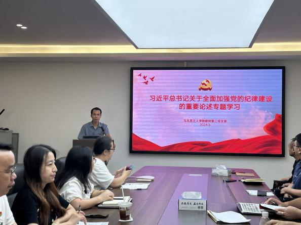 【本网讯】9月5日,马克思主义学院教师第三党支部在三水校区召开理论学习专题会,深入学习贯彻习近平总书记关于党的纪律建设的重要论述以及党的二十届三中全会精神,旨在深化党员对党纪法规的认识,强化党支部的建设与管理。支部书记蔡宗坚副教授讲专题党课,教师第三党支部全体党员教师参加。