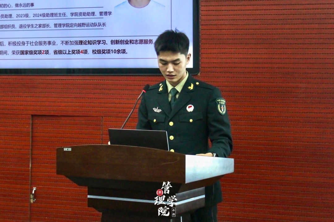 接下来,由发展对象学员代表、退役大学生代表、国家奖学金候选人陈东昇同学以“戎装激扬凌云志、共以青春筑年华”为题,作学业经验分享。陈东昇同志分析了自己从军人到学生的转变,强调了在军队中培养的纪律感和责任感,以及退役后在学习、学科竞赛、服务学院工作、服务社会等方面取得的成果。青春如歌,梦想如炬,他表示国家奖学金于他而言,不仅是荣耀,更是激励他继续前行的火种,他将以己之获,燃起他人奋进的热望。最后,陈东昇同学表达了自己对未来的展望,强调学习、实践和志愿服务的重要性,并鼓励同学们为实现梦想而奋斗。