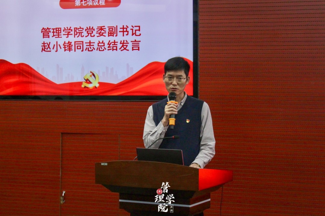 最后,管理学院党委副书记赵小锋同志为本次大会作总结发言。赵小锋同志聚焦于管理学院在守正创新方面的探索与实践,深刻阐述了在新时代背景下,如何更好地推动学院各项工作的全面发展。他先是以学院内退役大学生为例,思考如何将其正能量传播至全院2700余名学生中,以推动教学、学生工作及党团建设取得新进展;并进一步强调守正意味着我们要严肃对待每一项工作,强化对自身素质的严格要求,又介绍对退役复学大学生开展的创新举措。最后,他鼓励同学们要将奋斗与规划紧密结合,助力今后在学院的学习生活。