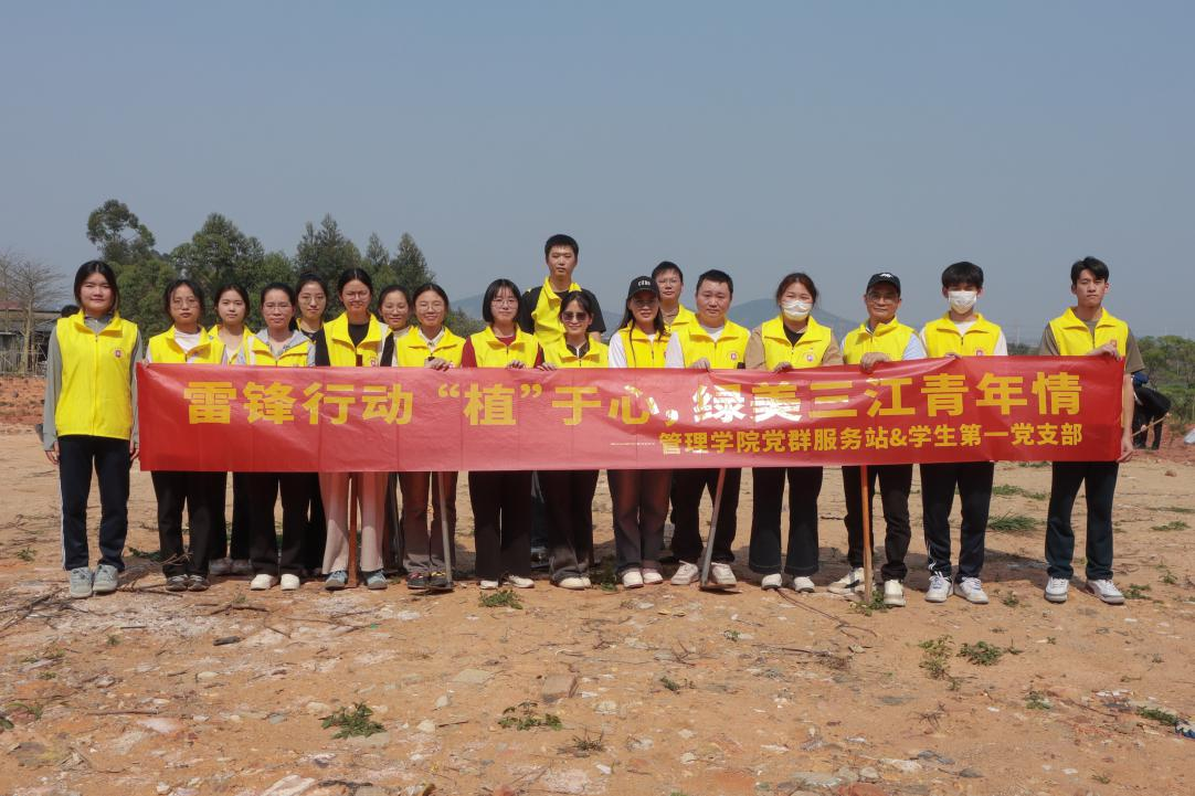 【本网讯】阳春三月,万物复苏,正是植树添绿的好时节。为深入贯彻习近平生态文明思想,践行雷锋精神,弘扬“奉献、友爱、互助、进步”的志愿服务理念,增强党员、群众的生态环保意识,2025年3月21日,管理学院党群服务站和“梦·享·家”一站式学生社区成员在指导老师们的带领下,携手共建单位三江村党委,共同开展了“雷锋行动‘植’于心,绿美三江青年情”主题植树活动。此次活动将红色精神与绿色生态相结合,以实际行动为三江村增添新绿,传递生态文明建设的责任与担当。