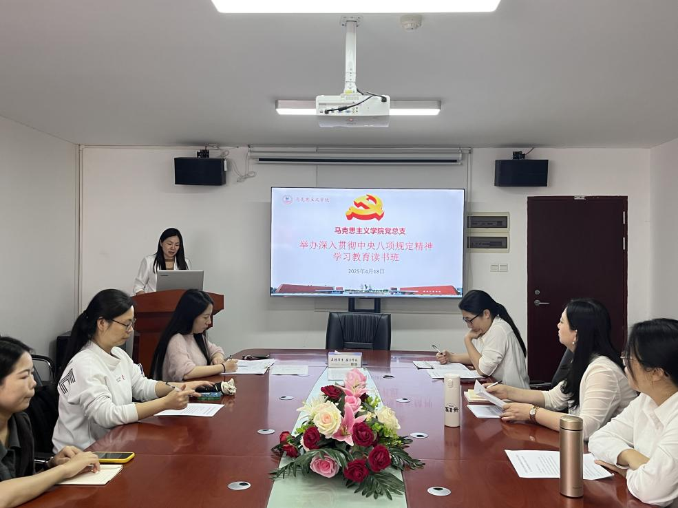 为深入学习贯彻习近平总书记关于加强党的作风建设的重要论述和中央八项规定及其实施细则精神,示范带动学院学习教育走深走实,4月18日下午,马克思主义学院党总支举办深入贯彻中央八项规定精神学习教育读书班,学院党总支书记及委员、各教师党支部书记及委员参加,会议由党总支副书记谭丽婷副教授主持。