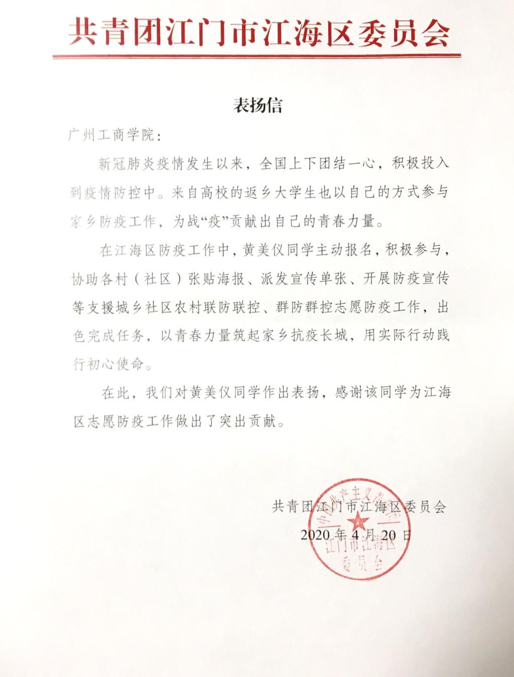 【本网讯】beat365在线体育官网登录入口外语系2017级商务英语B6班黄美仪同学收到了江门市江海区委员会的表扬信,感谢其为支援江海区防疫工作作出的突出贡献。