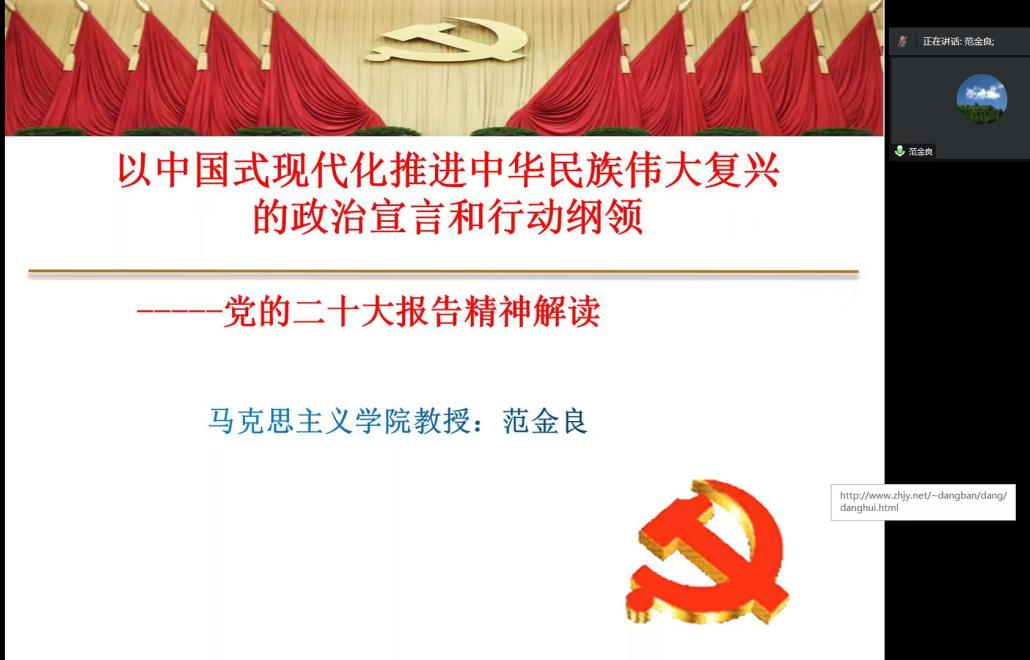 范金良教授从五个方面系统阐释党的二十大精神:一是高瞻远瞩。报告提出主题、旗帜、道路、目标方向等关系党和国家至关重要的重大问题。高举中国特色社会主义伟大旗帜,全面贯彻习近平新时代中国特色社会主义思想,弘扬伟大建党精神,自信自强、守正创新,砥砺奋发、勇毅前行,为全面建设社会主义现代化国家、全面推进中华民族伟大复兴而团结奋斗。他指出,报告总结了过去五年的工作和新时代十年取得的伟大变革,从而确立习近平同志党中央的核心、全党的核心地位,确立习近平新时代中国特色社会主义思想的指导地位,反映了全党全军全国各族人民共同心愿,是党的十八大以来我们党作出的重大政治抉择,是新时代十年最重要的政治成果,也是取得伟大变革的根本原因,对新时代党和国家事业发展、对推进中华民族伟大复兴历史进程具有决定性意义。二是理论创新。开辟马克思主义中国化时代化新境界—习近平新时代中国特色社会主义思想。党的二十大报告提出要不断谱写马克思主义中国化时代化新篇章,首先要把握好新时代中国特色社会主义思想的世界观和方法论,必须坚持人民至上,坚持自信自立,坚持守正创新,坚持问题导向,坚持系统观念,坚持胸怀天下。习近平新时代中国特色社会主义思想科学内涵、主要内容、世界观和方法论共同构建了习近平新时代中国特色社会主义思想体系。三是擘画蓝图。报告明确了全面建设社会主义现代化强国的实践途径,以中国式现代化推进中华民族伟大复兴,分为两步走,把握重要原则,发扬斗争精神,增强忧患意识、增强全国人民的志气、骨气、底气,经受重大风险挑战,开辟中国特色社会主义现代化国家新天地。四是系统推进。报告全面部署了建设社会主义现代化国家的大政方针和工作任务;全面建设社会主义现代化国家要把握高质量发展这一首要任务,以教育、科技、人才为基础性、战略性支撑,发展全过程人民民主,坚持全面依法治国,为民造福。五是根本保障。报告指出要坚定不移全面从严治党,找到党跳出历史周期率的第二个答案,坚持自我革命、自我净化,深入推进新时代党的建设新的伟大工程。