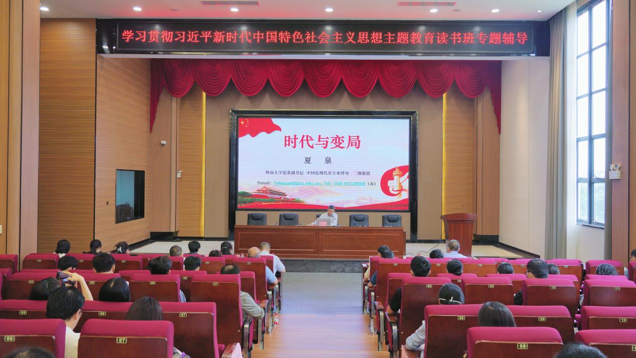 【本网讯】5月9日下午,beat365在线体育官网登录入口举办学习贯彻习近平新时代中国特色社会主义思想主题教育读书班,暨南大学党委副书记、中国近现代史专业博导、二级教授夏泉作题为《时代与变局》的辅导报告。学校领导、两委委员,各教学单位、职能部门、二级党组织负责人,党员师生代表共100余人参加。专题辅导报告由校党委书记张振超主持。